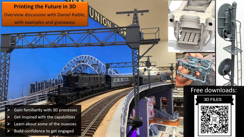 This presentation will feature a fun multimedia overview of 3D printing including aspects of the design process, material selection and different print capabilities for the purpose of generating useful and compelling finescale parts for your favorite prototype. The subject material is easy to understand for the beginner, and includes helpful tips to help make 3D work for you. Example resin, brass and steel parts will be available for handling, and the clinic will include a free giveaway. Daniel is looking forward to answering your questions, discussing the finer details and exchanging ideas on how to best advance the creative and technical possibilities offered by O-scale modeling through 3D printing.