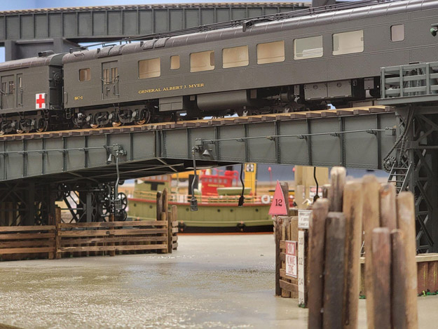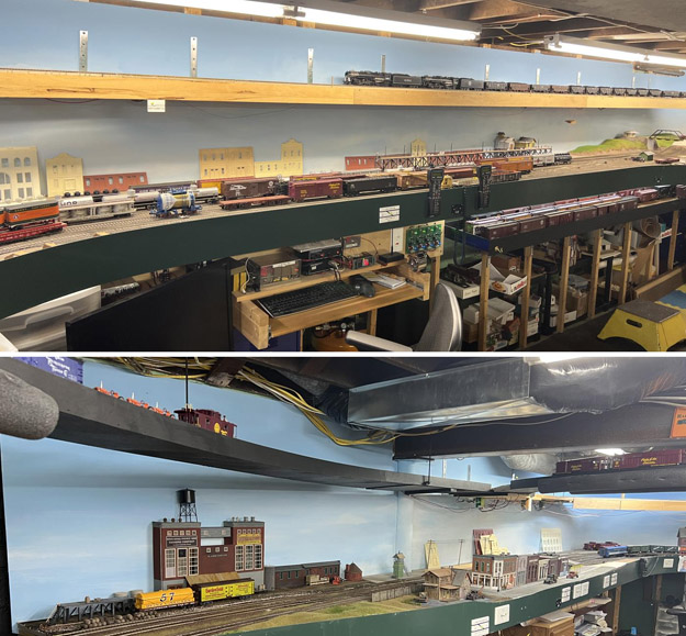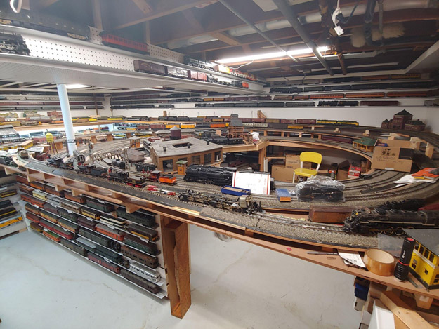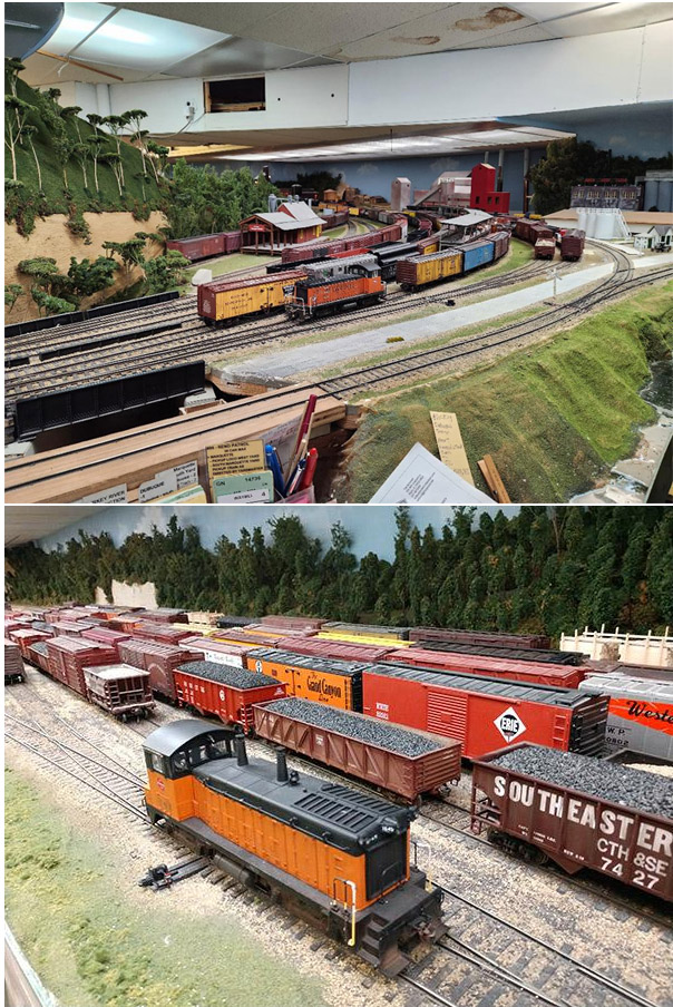 2-Rail Many different passenger and freight trains. Mostly steam to diesel “transition era” with occasional “modern era” trains with various railroads represented. Both standard DC and DCC operate in two separate sections with many highly detailed scenes.