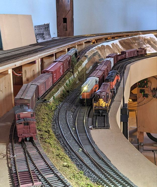 60% scenicked mult-ideck layout designed for operation. Northeast Iowa along the Mississippi River, in 1954 with a 900 foot mainline. Five yard jobs and various local switching jobs. Passenger trains and through-freights hauling a variety of products, such as meat and perishable goods, grain, coal, and oil. 1:2 SLOW clock. NCE DCC Control system. Operations via Train Dispatcher Authority using telephone line and train order signals. Car movements handled by car cards. Ideal operations require 20 operators.